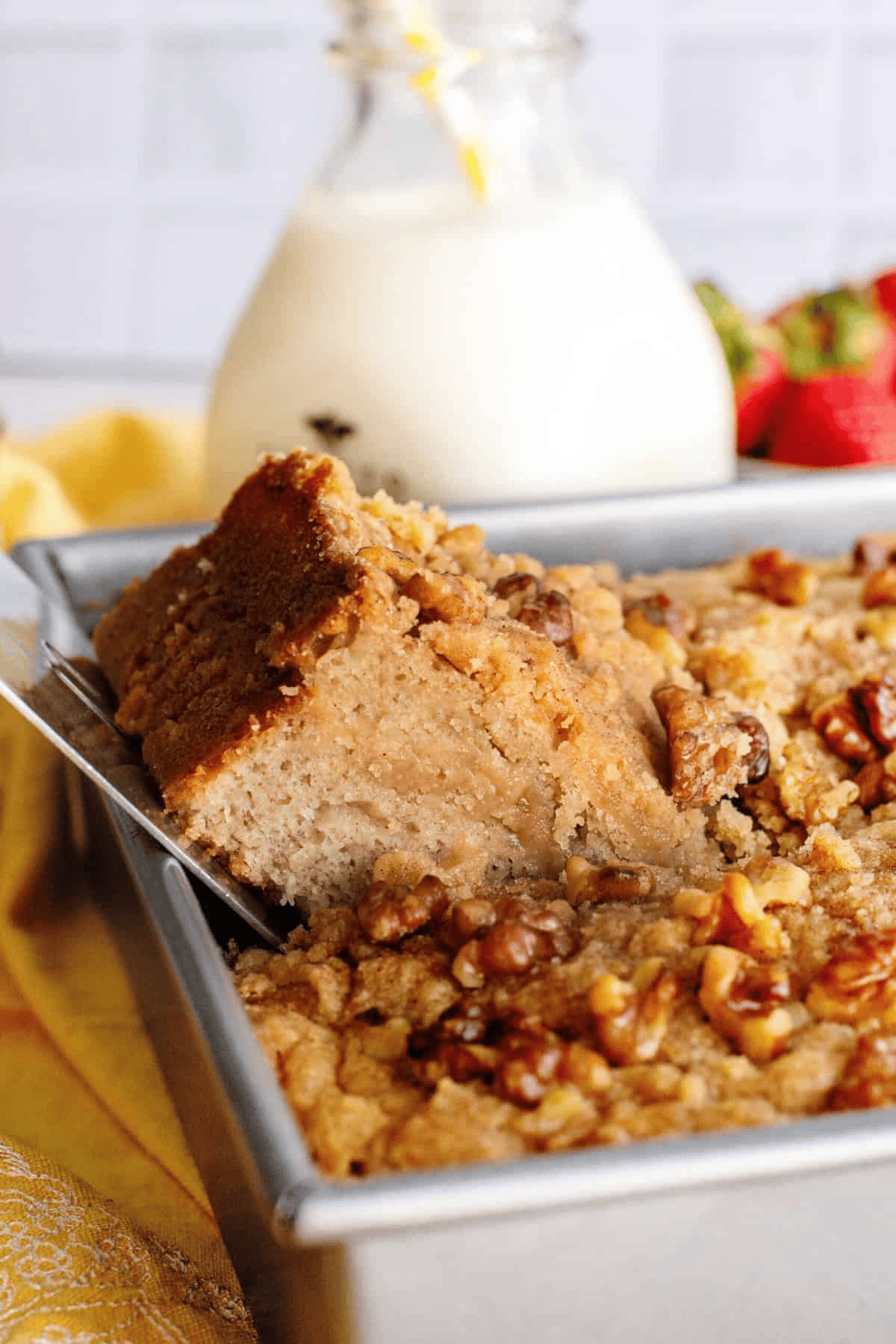 - Add a glaze:ย For an even more indulgent cake, top your banana crumb cake with a simple vanilla glaze. Make by combining 1 cup of powdered sugar with 1โ2 tablespoons of milk and 1 teaspoon of vanilla extract and drizzling it over the cooled cake.