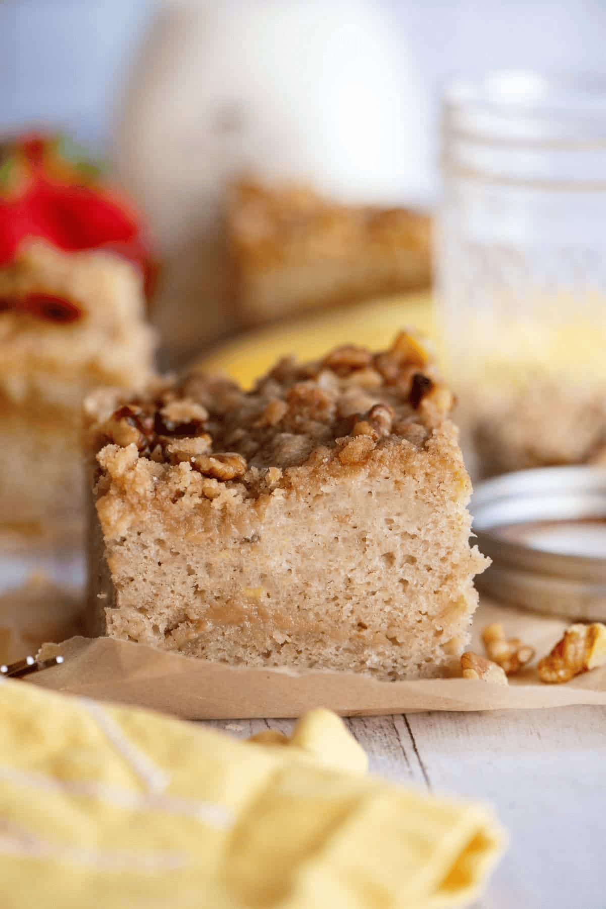 Thank you for this recipe! I usually hate anything with bananas baked in it. But love this cake…. it is so delicious! The banana flavor is very mild. I have made this cake multiple times with very ripe and not so ripe bananas and it always turns out delicious and moist. My son who will not eat bananas in any form loves this cake and asked me to make it. I have also frozen one of the 8×8 baked pan and it thaws out wonderfully. I also love the soft crumb topping, they are a perfect combination with the cake. Thank you for the perfect coffee cake recipe!