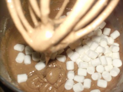 The batter should be well blended. Fold in the marshmallows. Pour the batter into the prepared pan. Place the pan it the oven.