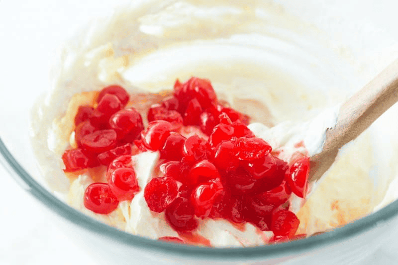 - Save a few cherries:ย Hold back some maraschino cherries to garnish the top of the cake just before serving.
