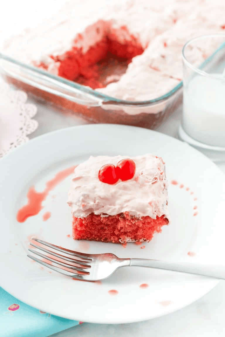 - Use white cake mix:ย White cake mix lets the cherry gelatin shine and gives you that bright pink color you are looking for.