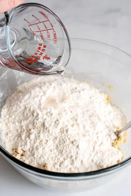 - Add the remaining flour, melted butter, and water. Stir together well. The dough will look like a big old lumpy blob.5 cups all-purpose flour, 1 stick unsalted butter, 1.5 cups warm water