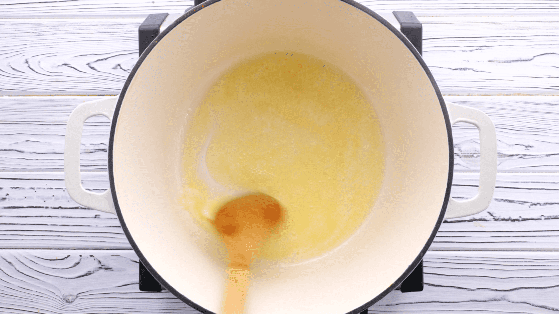 - Melt butter in a large stockpot over medium heat, then cook and stir in flour to make a smooth paste (about 3 minutes).5 tbsp butter, 5 tbsp all-purpose flour
