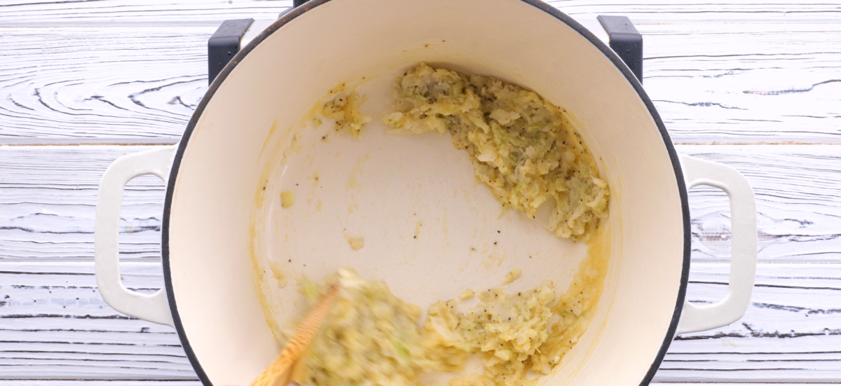- Mix in onion, celery, and garlic, and season with salt and pepper. Continue to cook and stir for about 4 minutes.1 small white onion, grated, 1 stalk celery, grated, 2 minced garlic cloves, salt and pepper to taste