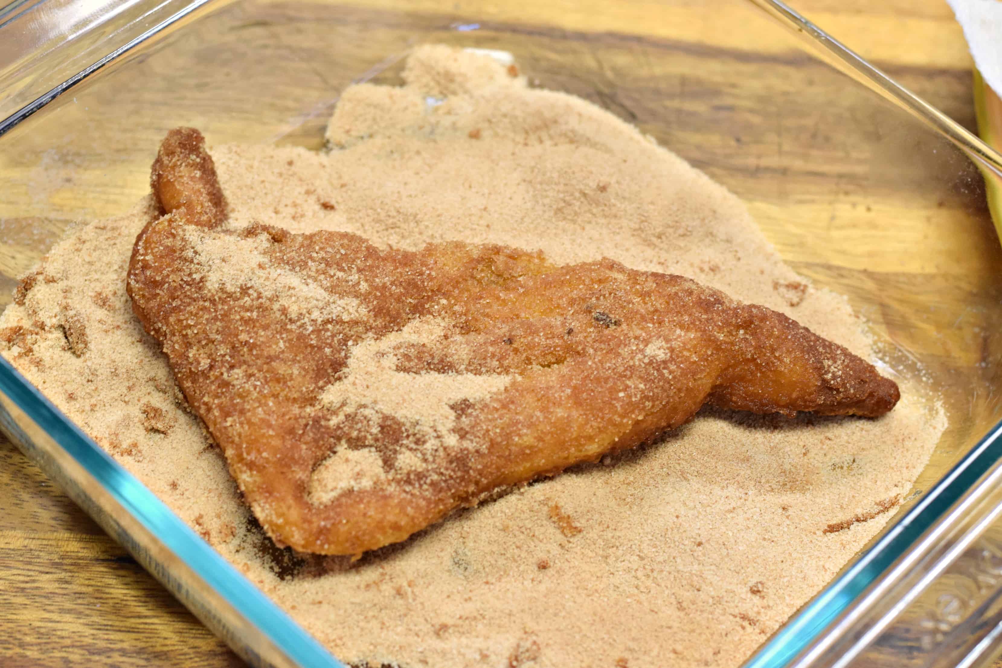 When you get around to it, you want to dip each side of each sopapilla into the cinnamon sugar mixture.