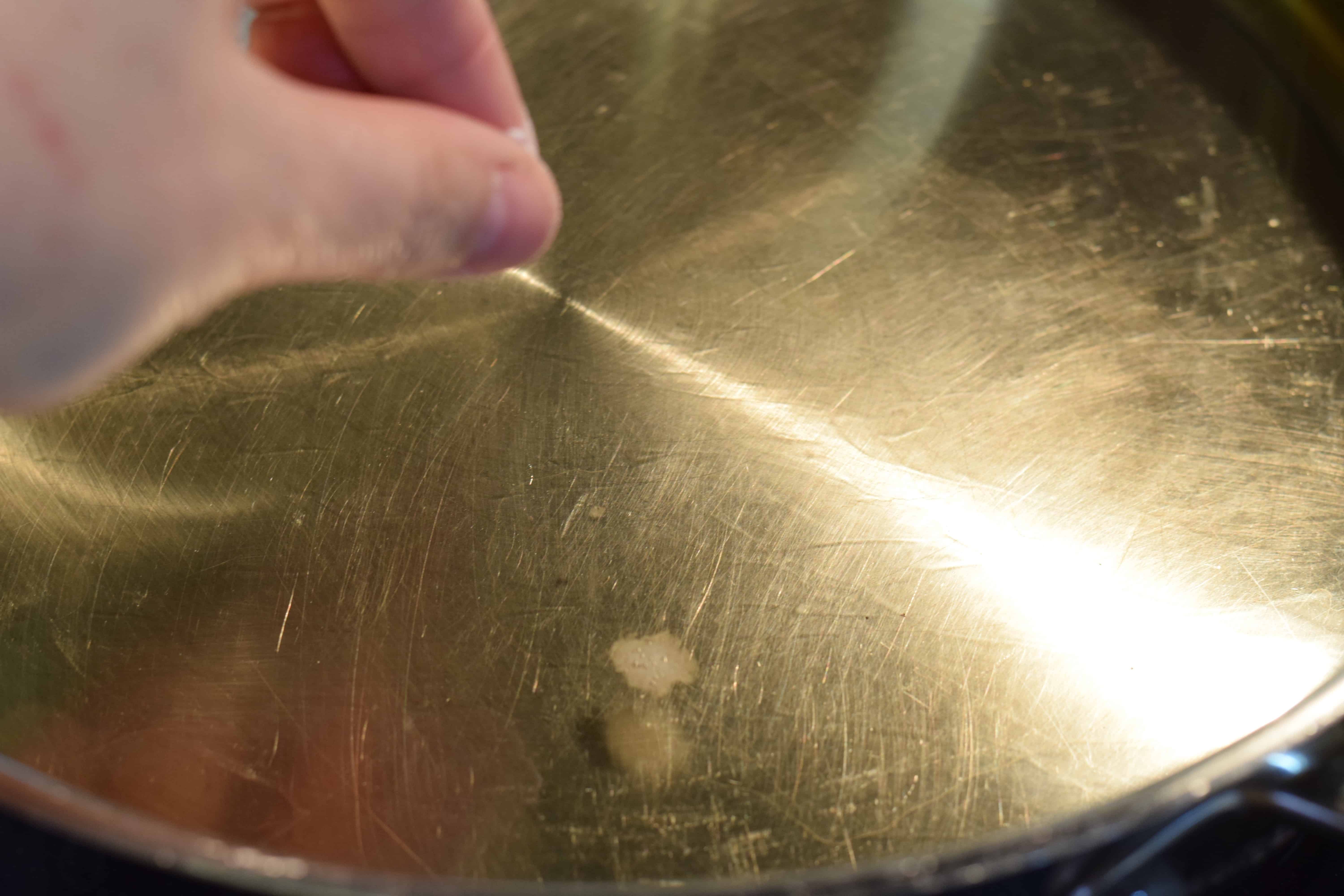 You know it is ready to fry when you sprinkle just a pinch of flour in it and the flour bubbles like it’s doing in this picture.