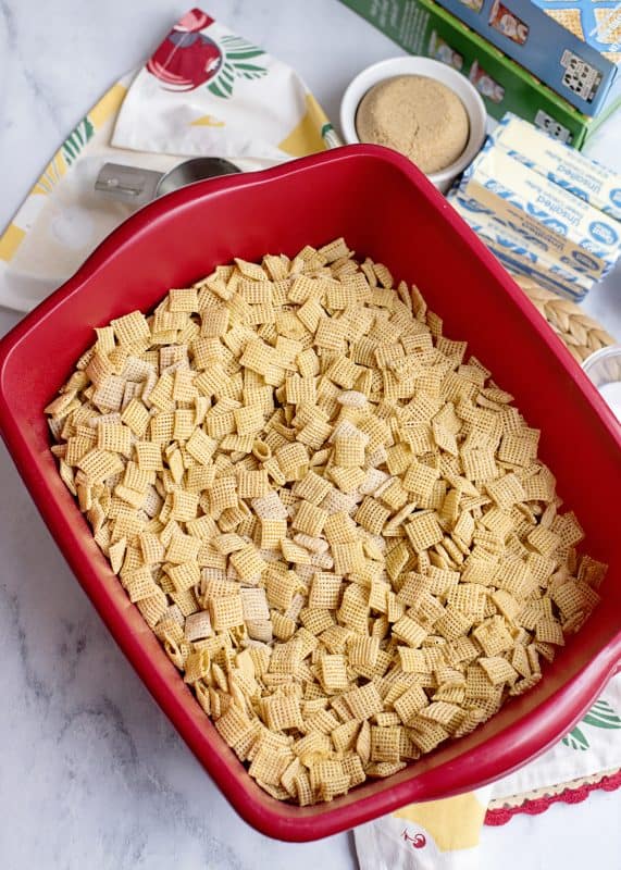 Keep an eye on this as this sweet Chex mix recipe can burn pretty quickly.