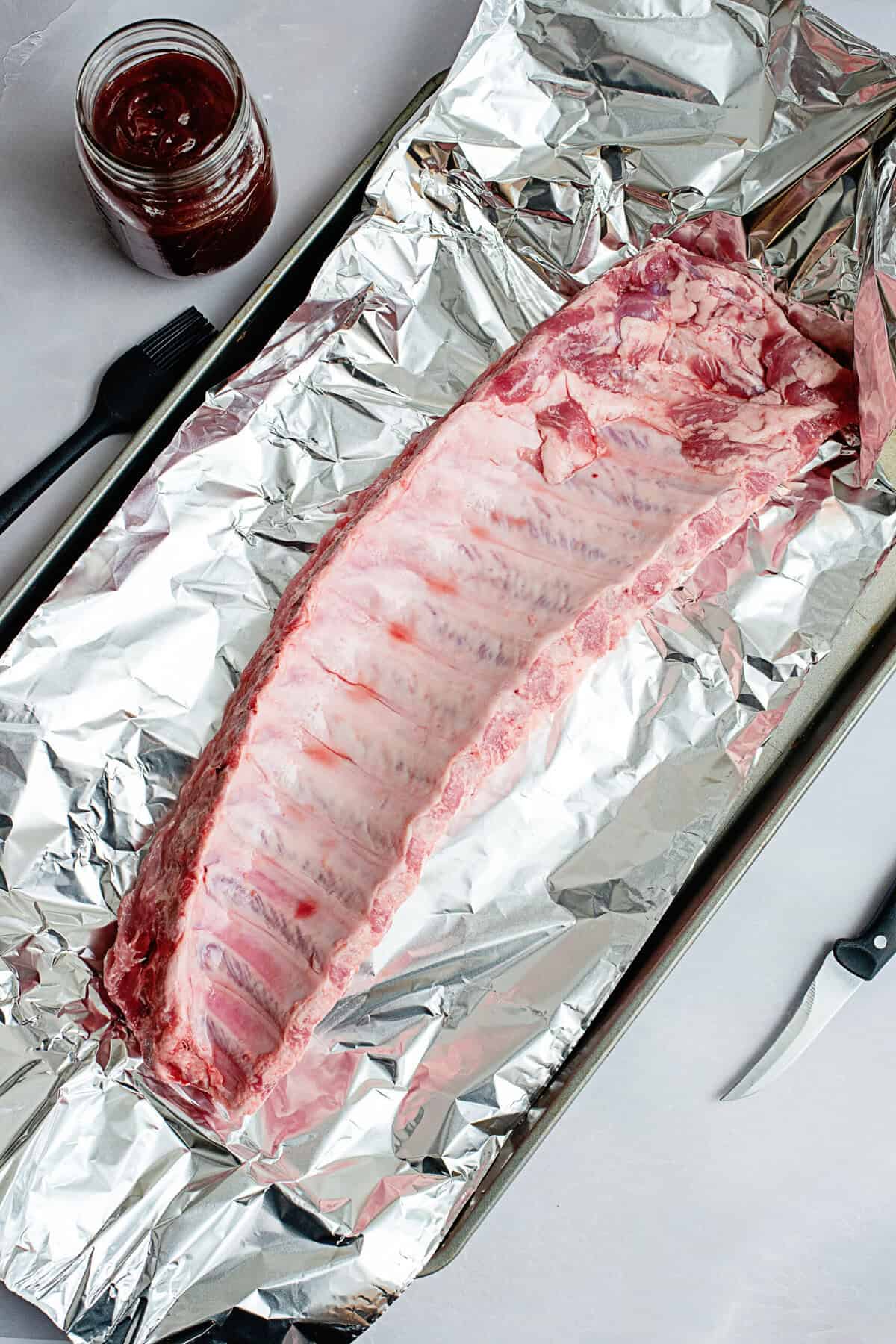 You’ll see that I’ve placed the rack of ribs on a baking sheet lined with aluminum foil. This step is important because we’re about to baste them and wrap them tightly to lock in all that moisture.