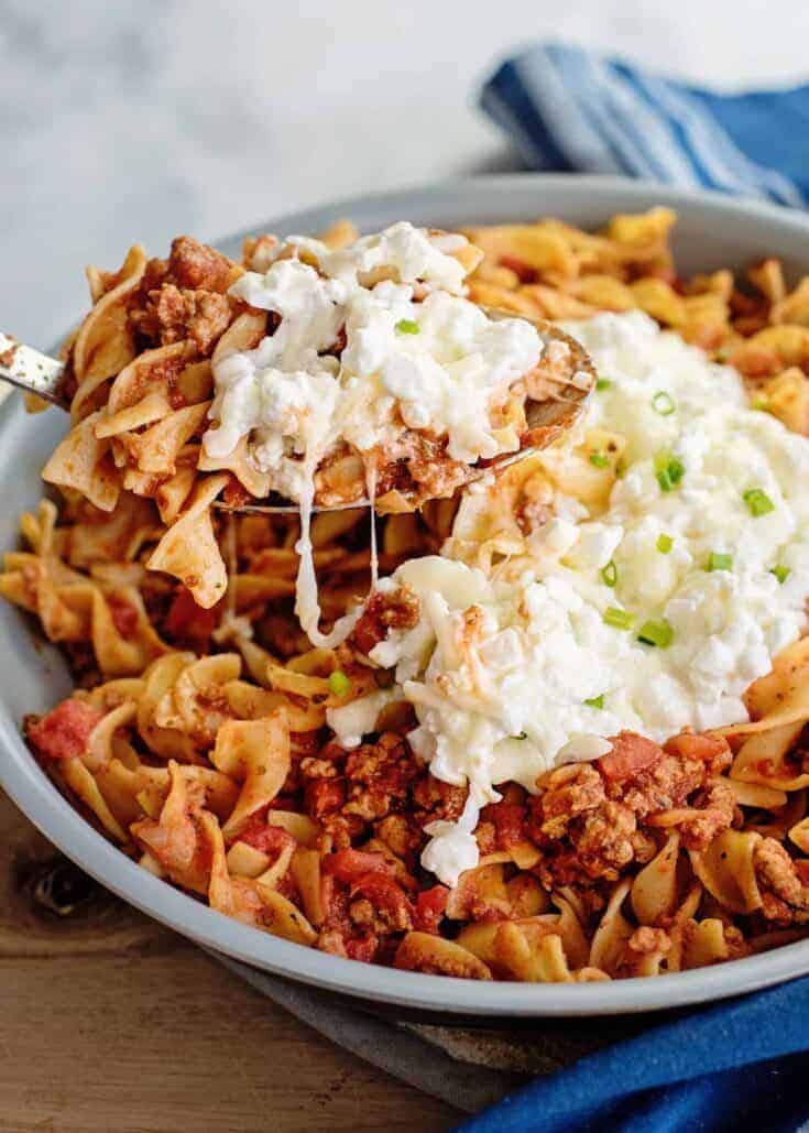 This easy skillet lasagna recipe takes just 20 minutes to make and is made with ground beef, egg noodles, cottage cheese, mozzarella cheese, tomatoes, and lots of flavorful seasoning.