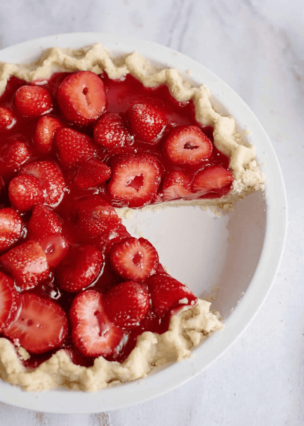 Strawberries are kind of synonymous with Valentine’s Day, aren’t they? I have lots of strawberry dessert recipes, but let’s focus first on a strawberry pie. You only need 4 ingredients to make my fresh strawberry pie.