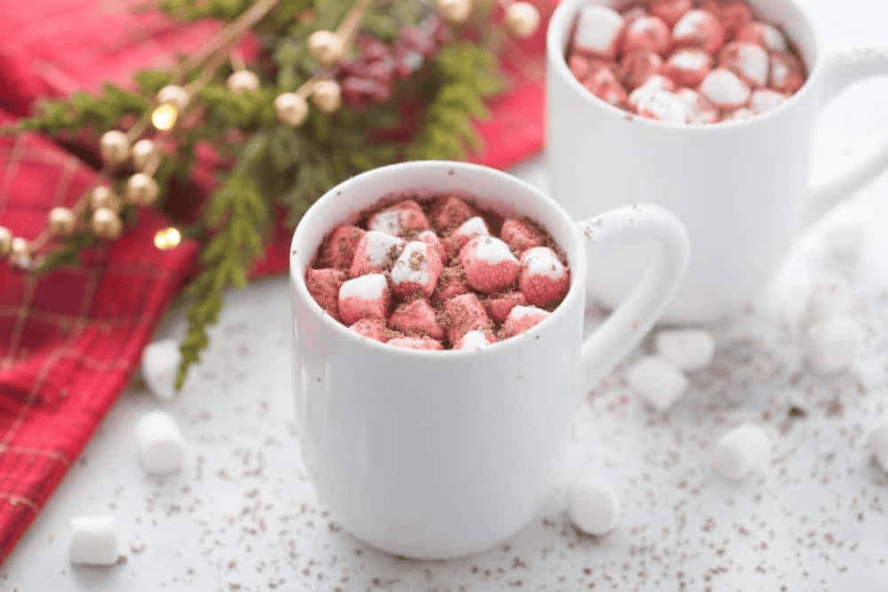 Red velvet hot chocolate takes your usual cocoa and dresses it up for Valentine’s Day. It has that familiar red velvet flavor and color, with all the warmth of a good mug of hot chocolate. Top it with whipped cream and you are set.