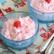 Cheesecake fluff is like cheesecake mousse and is made with just 4 ingredients (cream cheese, whipped topping, sugar, and cherry pie filling).