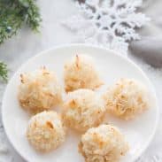 In a medium bowl, place all ingredients. Stir together by hand until well combined. Form the coconut mixture into one-inch balls and place them on the prepared baking sheet.