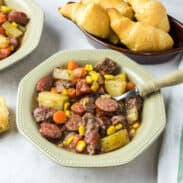 Overflowing with meat and vegetables, this tender and flavorful smoked sausage and beef stew is the perfect crockpot weeknight dinner.